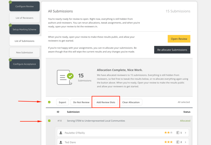 - Placing a check next to the left of the submissions that need new review slots