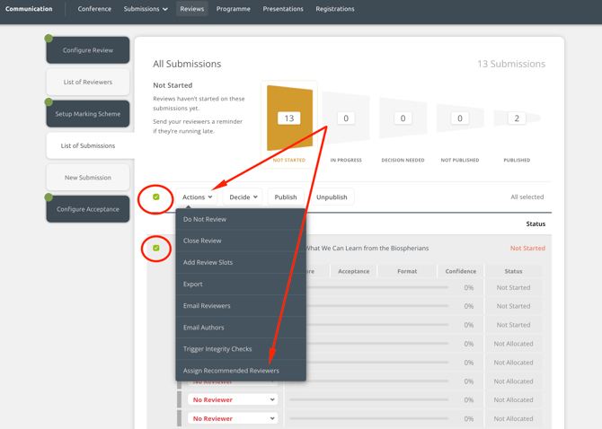 You can quickly assign recommend reviewers to one, multiple or all submissions that have empty reviewer slots. Recommended reviewers are those that: