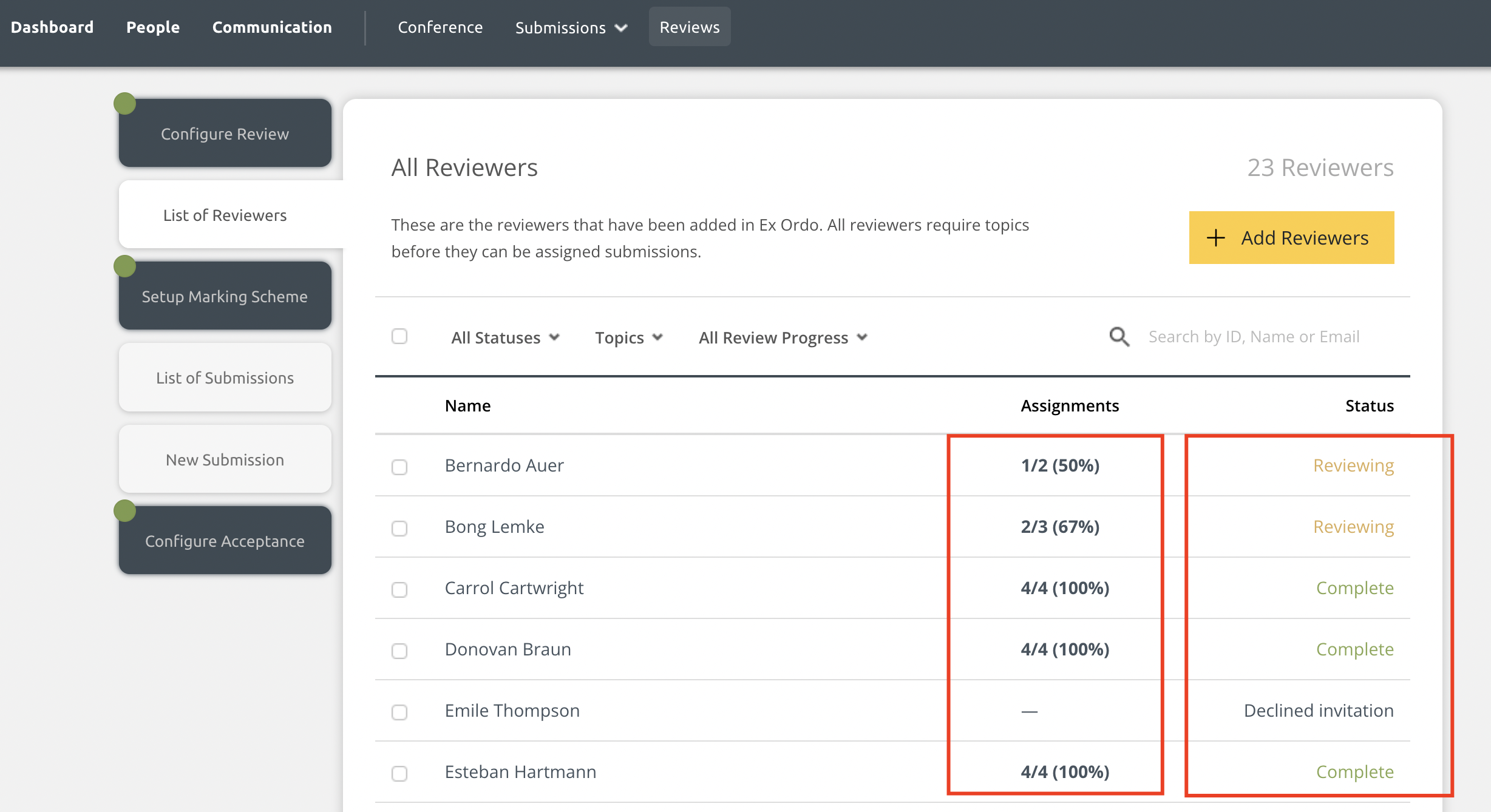In Ex Ordo, reviewers have different statuses to let you know if they are ready to start reviewing or allow you to understand their progress through the review. You can view these statuses by:
