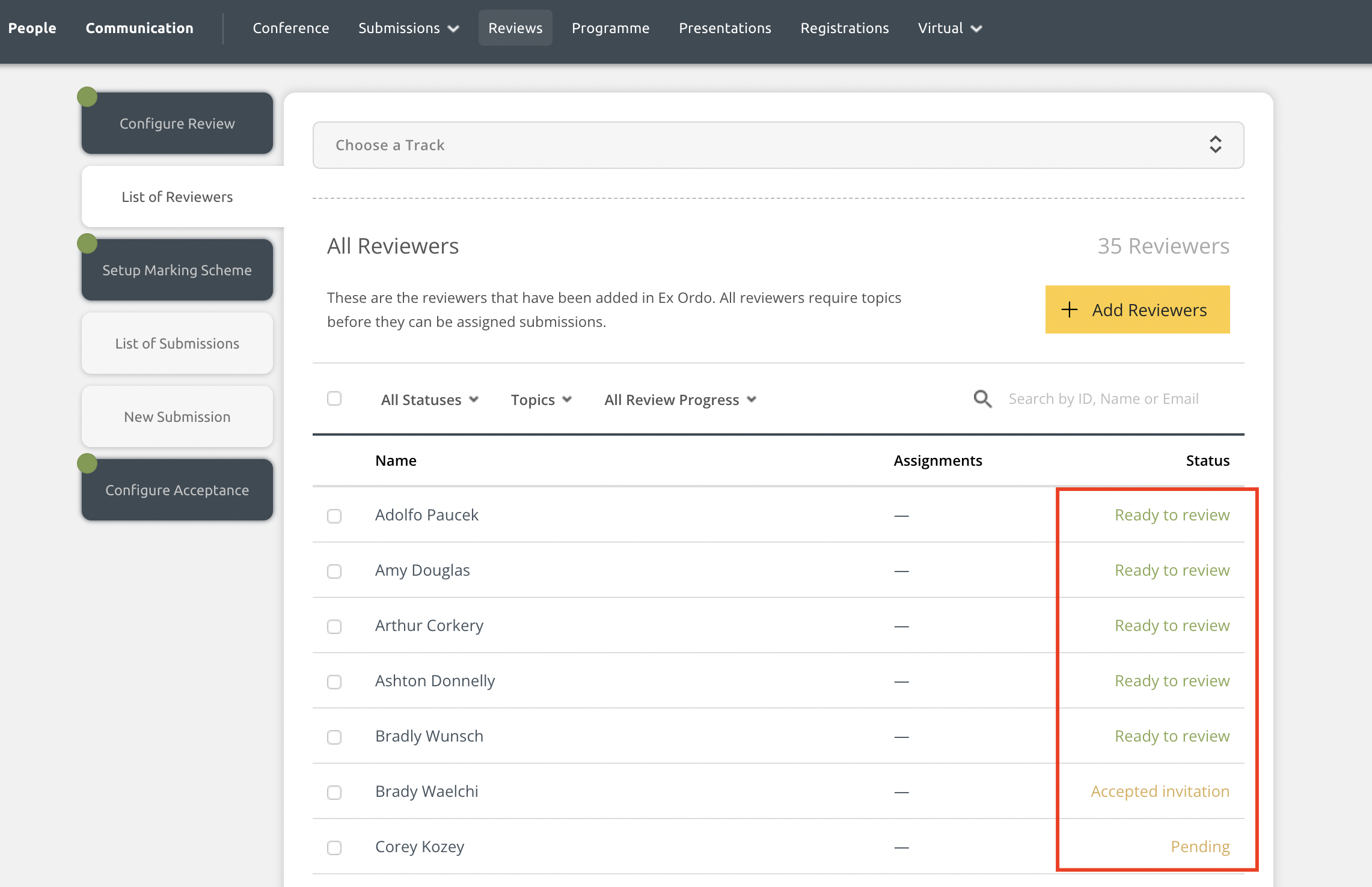 Once the review has begun, only reviewers who are Ready to Review will be considered for assignments. The others will remain on your list with their original status visible.