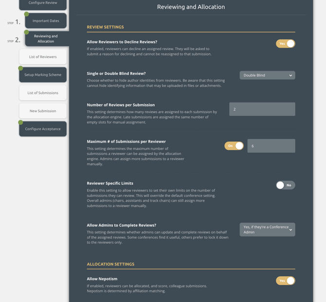This step is very important. It is where you configure settings that will impact the allocation and reviewer experience. Please see below for details on each step.