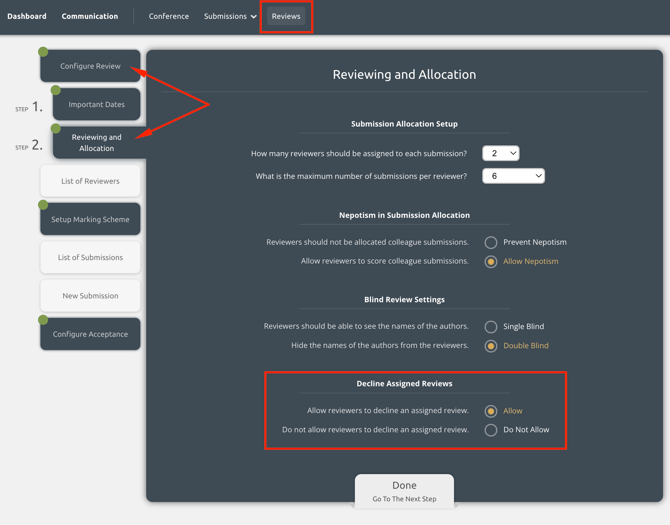Reviewers will be notified that it is time to start reviewing by sending invitations to reviewers. You may want to give them the option to decline a review in the system. You can either Allow or Do Not Allow reviewers to decline reviews by following the steps below.