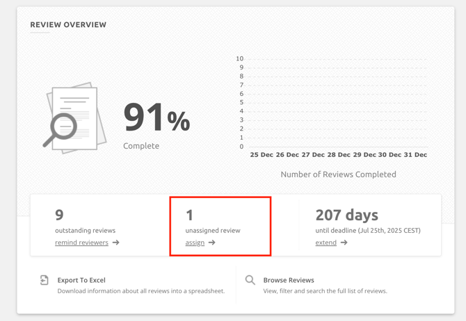 The Review Overview card shows the number of unassigned reviews. Admins can click on the assign button to view any unassigned reviews.