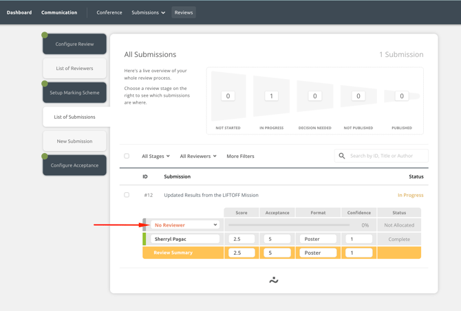 Admins can then assign a new reviewer by clicking on the no reviewer slot. Check out this article on changing review assignments during the review process for more information.