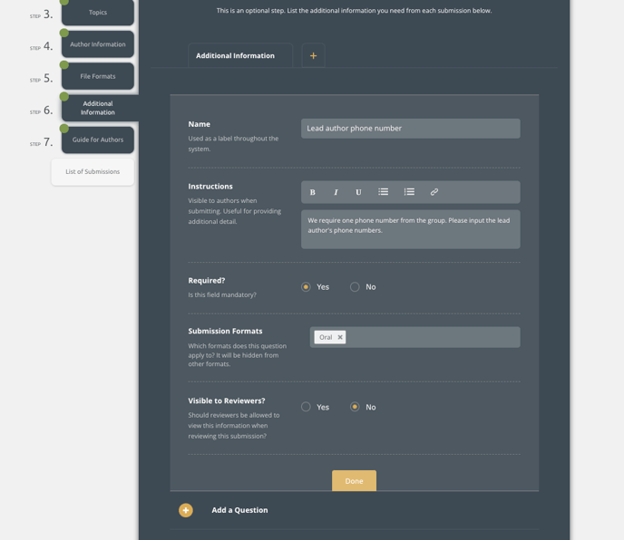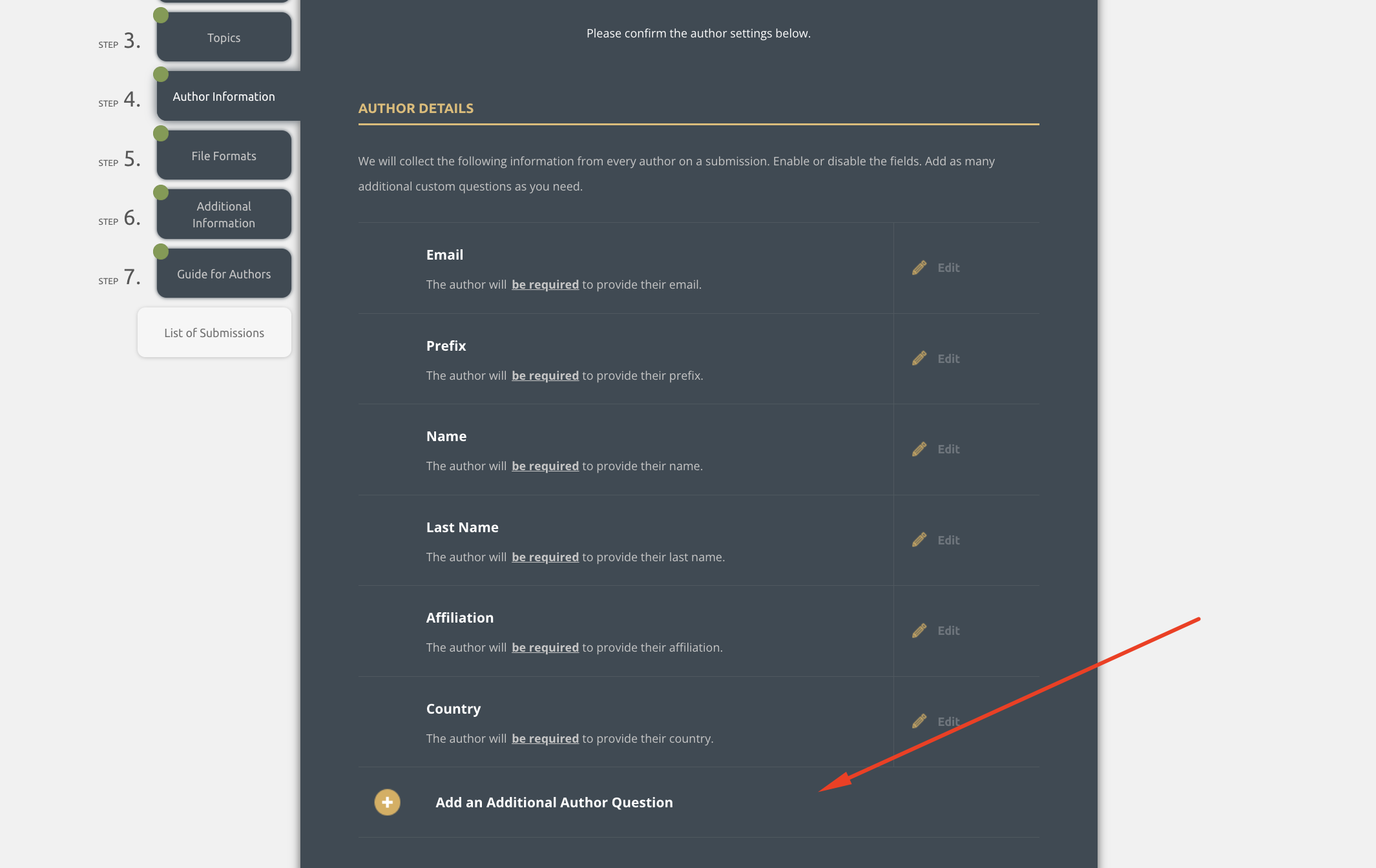 On the Author Information step when setting up submissions, you can select the type of question to ask your authors. These questions are linked to the author's profile and each author will be asked these questions.