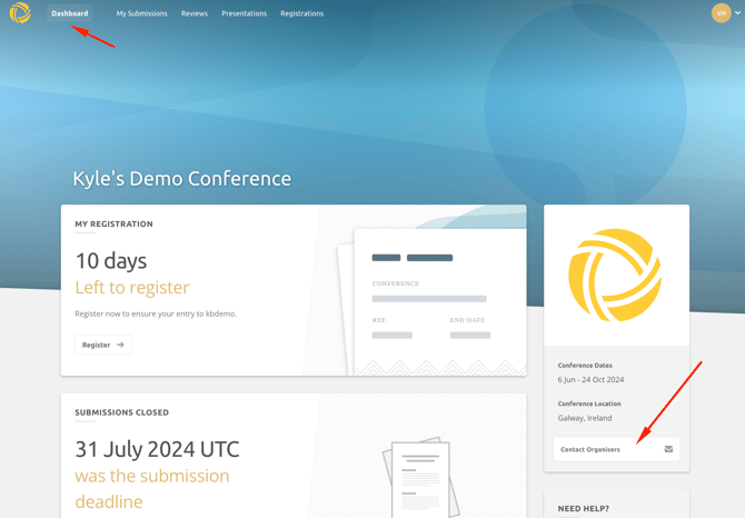 You can email the organisers by navigating to your dashboard and clicking on the Contact Organisers button on the right-hand side.