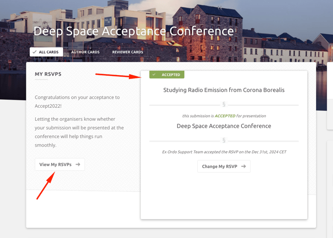 You are able to check the status of your RSVP by logging into the site and locating the My RSVPs card on your dashboard. The statuses include: