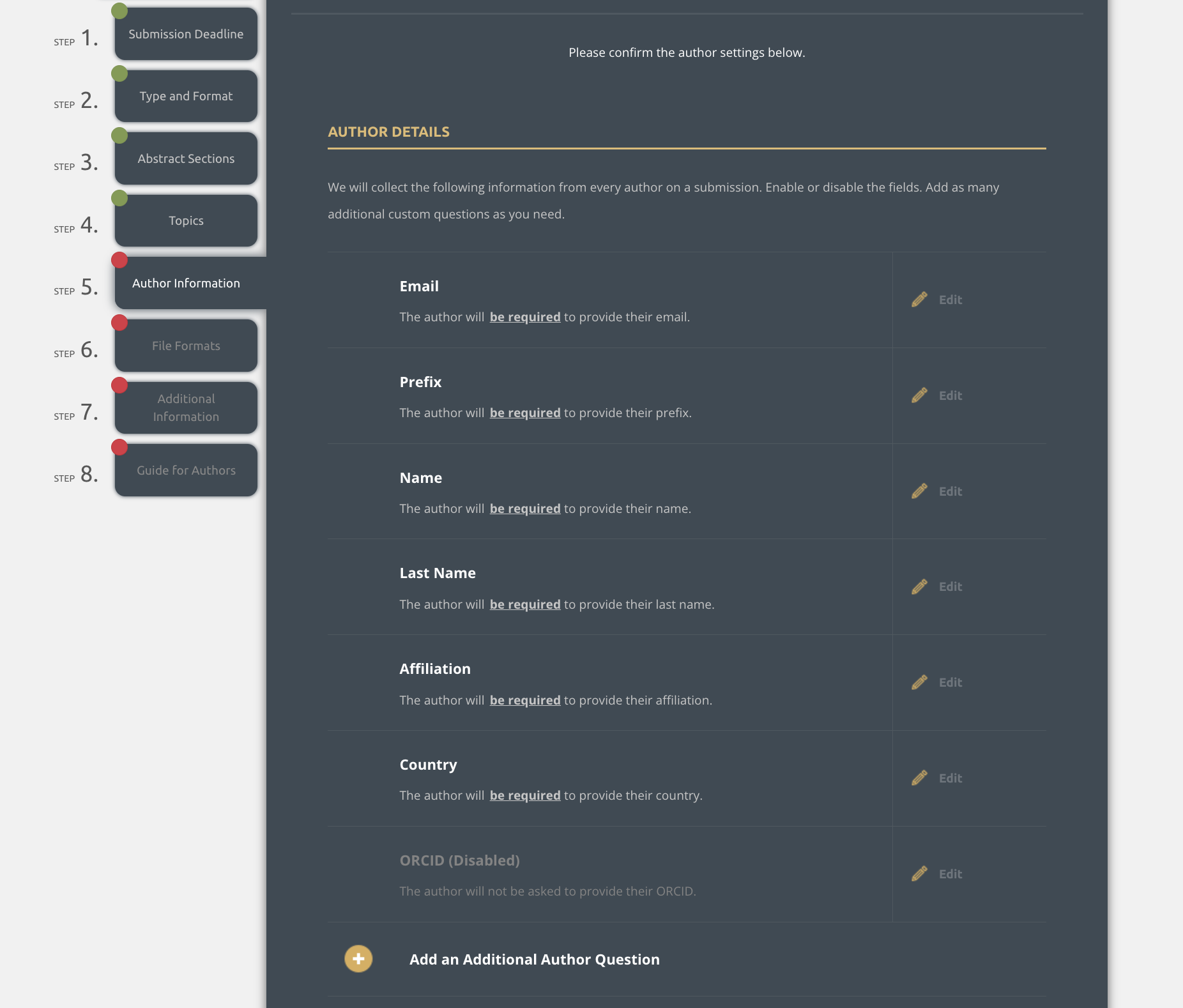 Please contact support@exordo.com before making changes to Step 4: Author Information if you have begun collecting real submissions.
