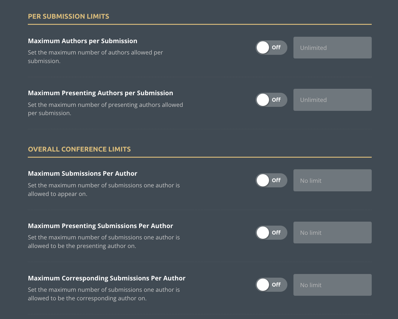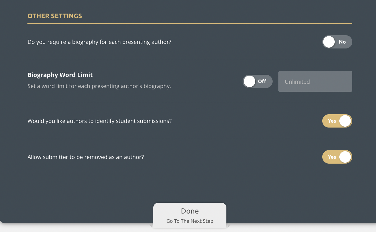 - Collect biographies from presenting authors, and set a word limit for the biographies if you do. Biographies are required, if enabled.