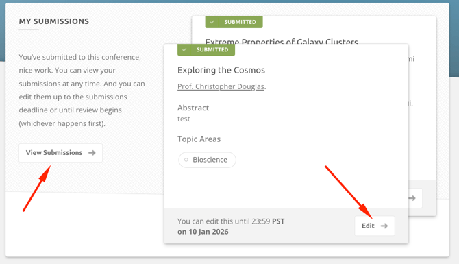 Locate the My Submissions or My Final Submissions card on your dashboard. You can select the Edit button on a specific submission or View Submissions to see your full list of submissions.