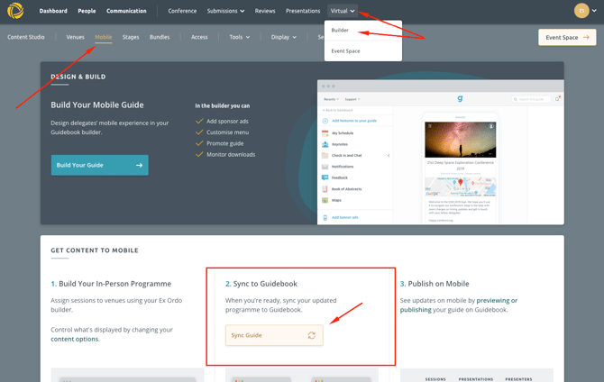 You can sync content from the Virtual hub into the mobile app by going to the Mobile tab and hitting the Sync Guide button.
