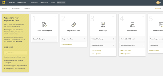 If you have clicked through the set up wizard already, you will be brought into the Registrations hub. There are 2 modes in the registrations hub: Test mode and Live. It is important to stay in test mode until you are ready for delegates to see the registrations hub.