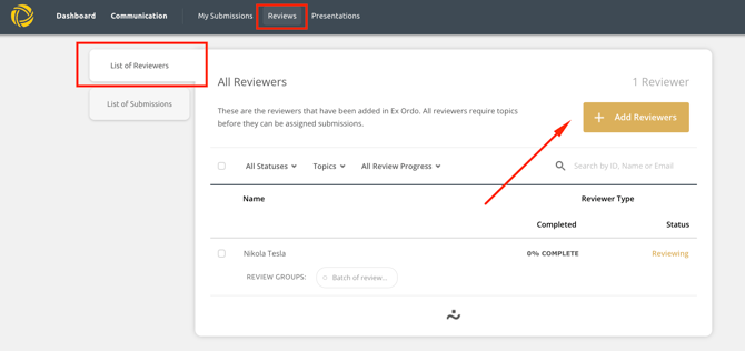 First, navigate to the Reviews hub and click on the List of Reviewers. Next, click on the Add Reviewers button.