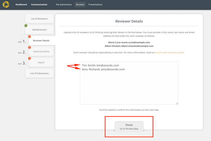 Be sure to ensure that each reviewer is listed on a separate line. Click the Done button to move to the next step.