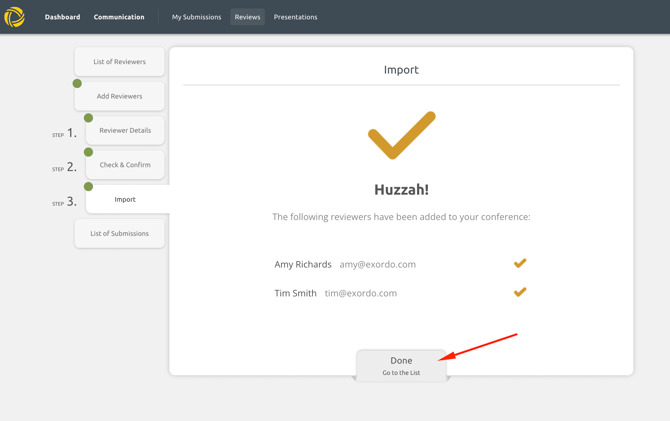 The system will work on importing your list which shouldn't take very long! Once finished, hit Done to view your reviewer's in the system.