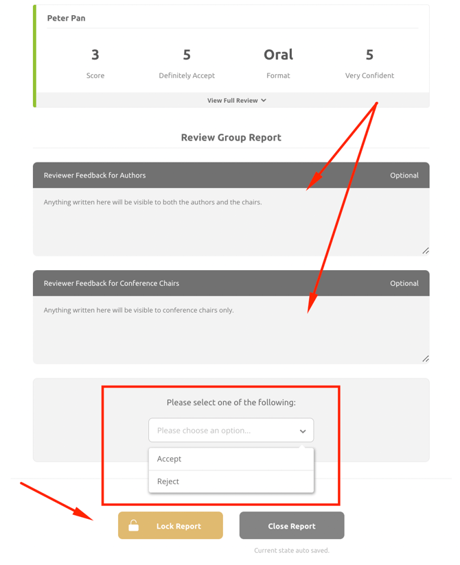 - A required field where you can recommend to Accept or Reject the submission.