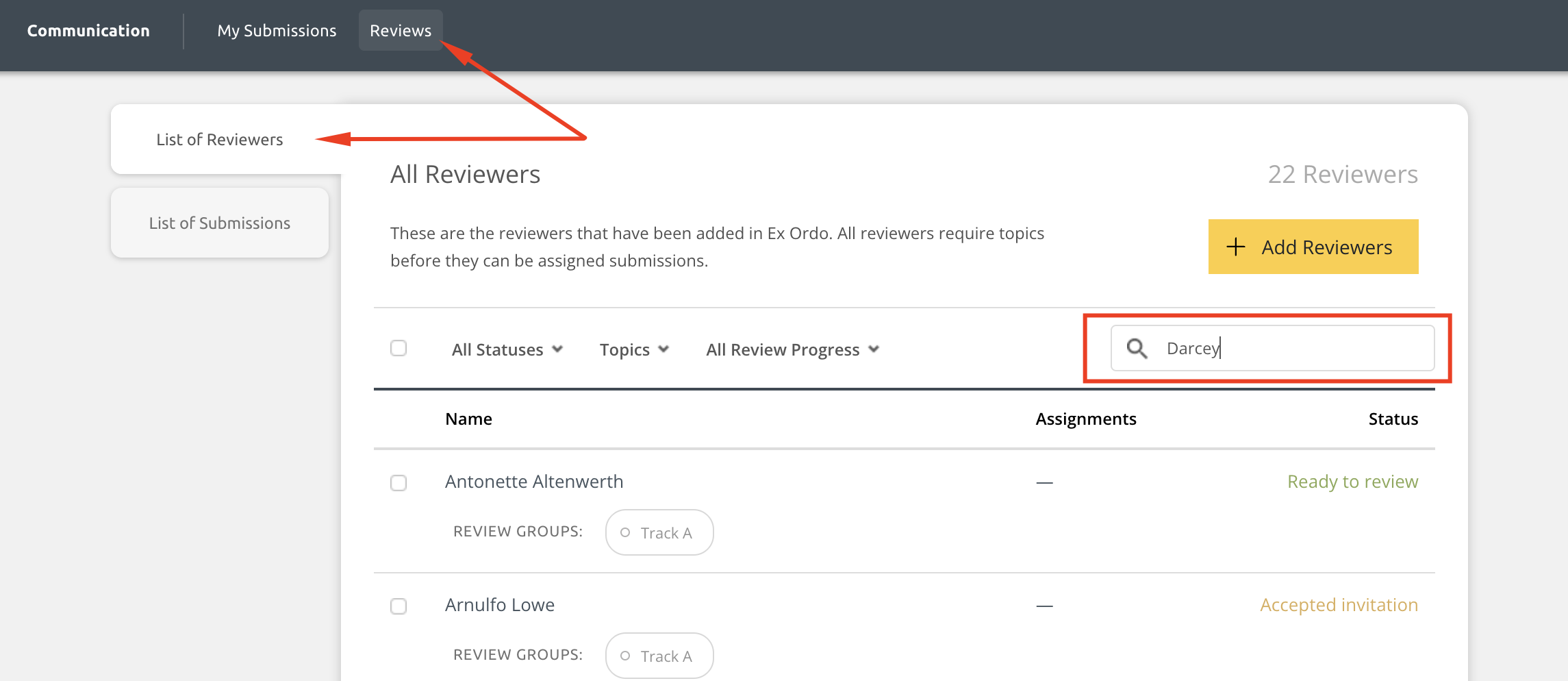 First, navigate to the Reviews hub and click on the Reviewers tab. You can look for the specific reviewer using the search bar.