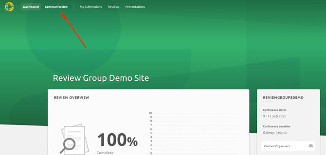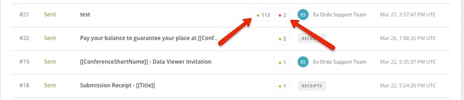 The communication hub will show a list of all messages sent from you, the review group chair. You can see the status of these messages by looking at the green and/or red dots. The example image below shows that 113 emails were successfully sent, but 2 failed.