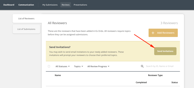 After adding reviewers into the system, you will immediately see a Send Invitations button. Click on this button and follow the prompts to send out your email.