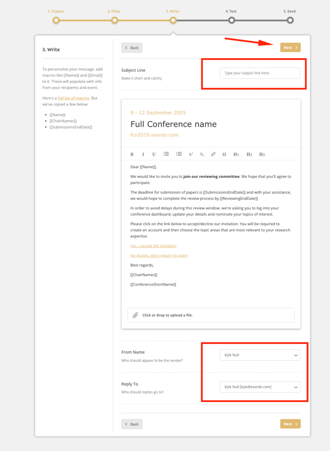 - Change the reply to email to your own at the bottom of the page - it will be set to the conference email by default. (optional)