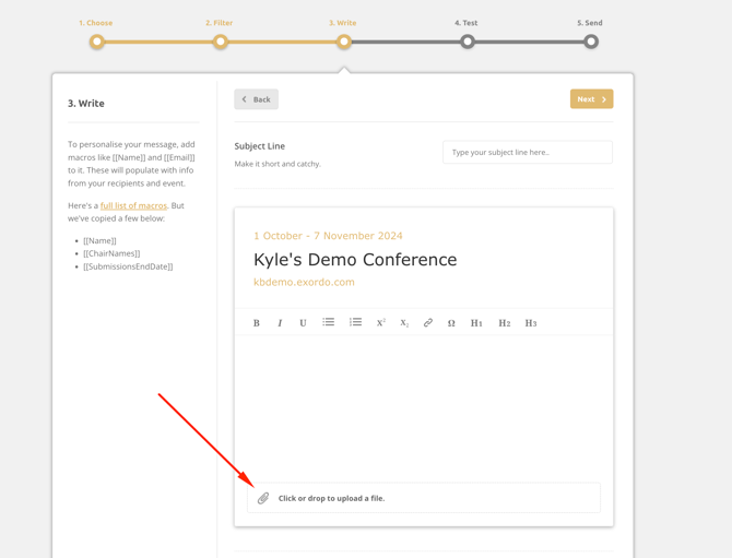 Review group chair: Uploading an attachment to an email Review group chairs can attach files to emails when viewing and editing content on the Write step. The file attachment field is visible at the bottom of the email text field. The file size limit for this attachment is 10 MB.