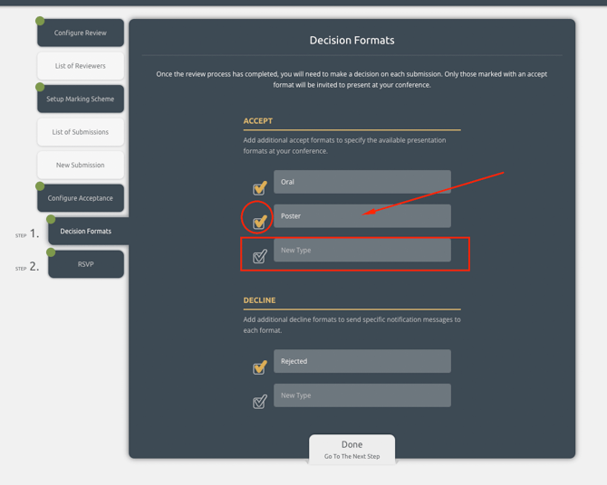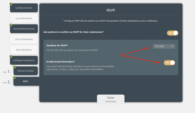 If enabled, authors can log into the system and confirm that someone will present their submission at the event. You can set an RSVP deadline and automate emails to authors who have not yet RSVPed 10 days, 3 days and 1 day before the deadline. Authors who have already confirmed or declined the RSVP will not be sent a reminder.