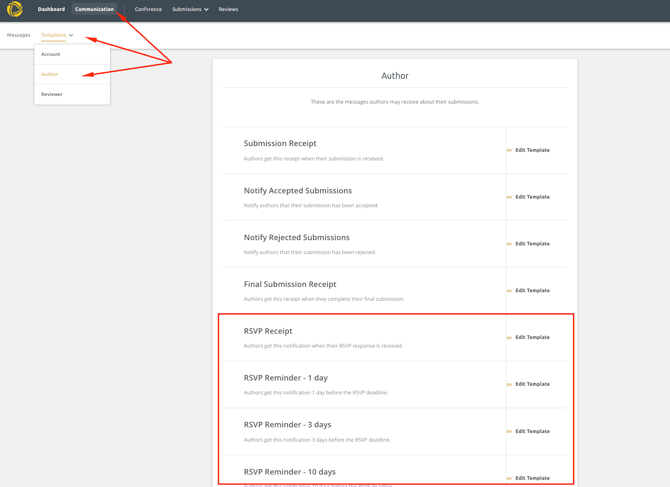 There are a few key email templates to be aware of if using the RSVP feature. You can view them if RSVP is enabled in the Communication hub. They are located under the Author section of the Templates drop-down menu. You can edit these to include important information such as reminding authors to upload a final paper or register for your conference.