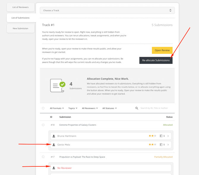 Once the system completed the automatic allocation you can change your allocation manually and reassign a submission to a reviewer on your review list of submissions.