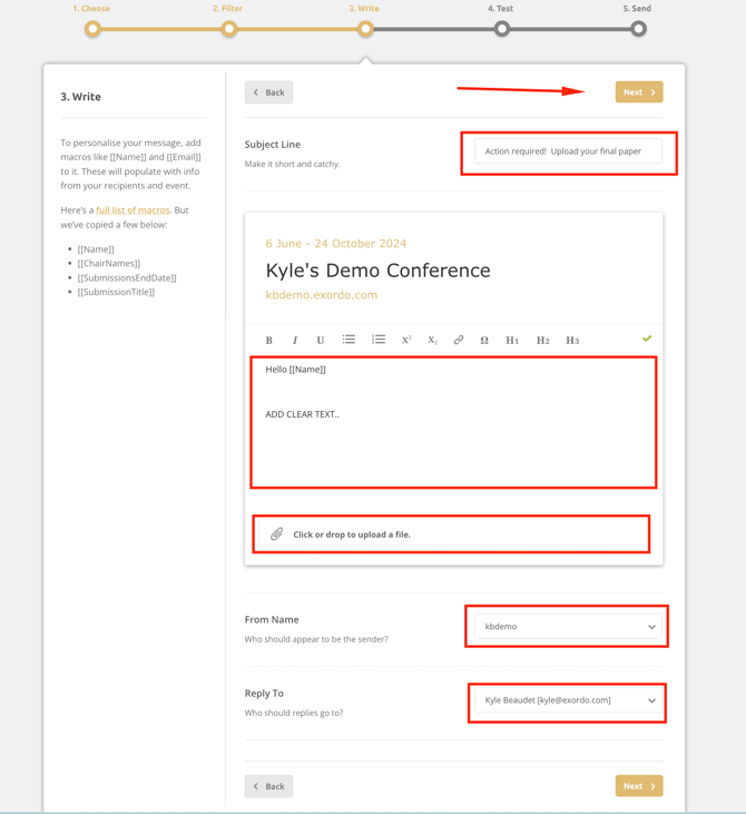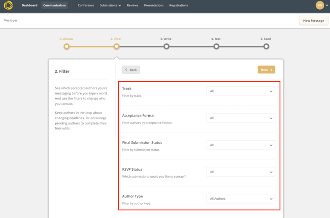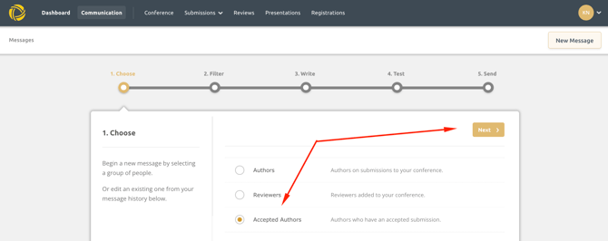 Choose Accepted Authors and click Next to filter your list and draft the email.
