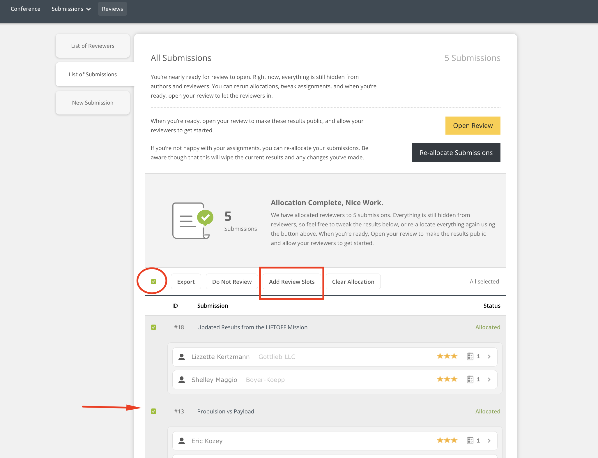- Place a check in the box to the left-hand side of the submission(s) that need extra reviewers.
