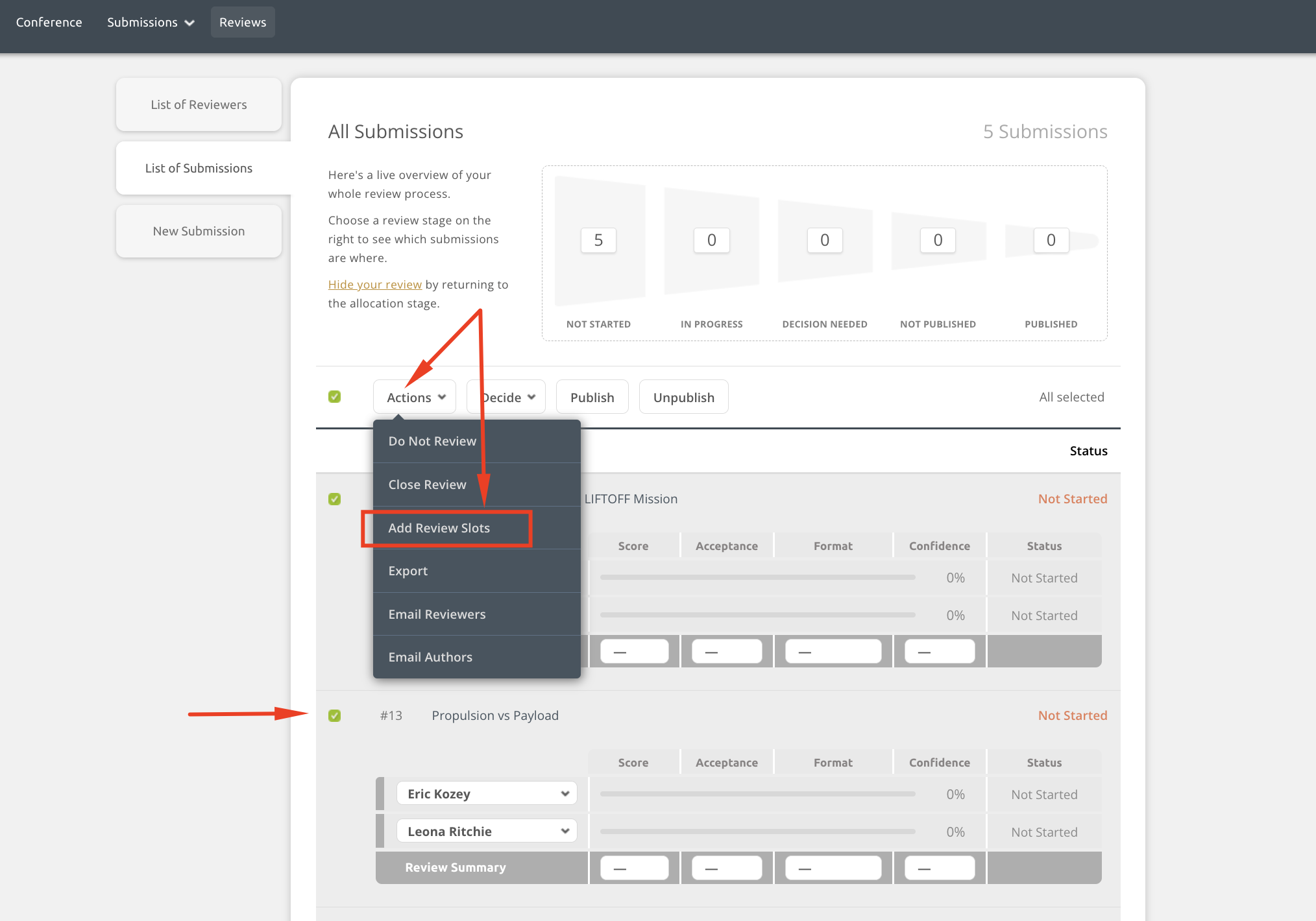 If you already started the review and you have some submissions that need additional slots you can still add them if a submission doesn't have a decision yet.