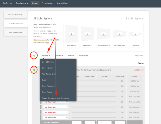 You can quickly assign recommend reviewers to one, multiple or all submissions that have empty reviewer slots. Recommended reviewers are those that: